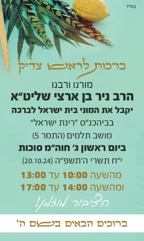 ביום ראשון ג’ דחוה”מ יקבל מורנו ורבנו הרב ניר בן ארצי שליט”א את המוני בית ישראל לברכה בבית הכנסת רינת ישראל במושב תלמים.