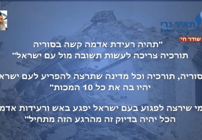 תאיר נרי > כותרת > הרב ניר בן ארצי לפני כשנה: “תהיה רעידת אדמה קשה בסוריה, תורכיה צריכה לעשות תשובה מול עם ישראל”