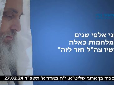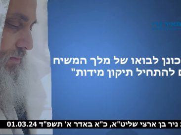 הרב ניר בן ארצי שליט”א: “מי שירצה להכשיל את בנימין נתניהו יכשל וייפול” “מי שירצה להכשיל את בנימין נתניהו יכשל ויפול” “אז הקדוש ברוך הוא אומר לכם. הקדוש ברוך הוא, מלך מלכי המלכים, הקדוש ברוך הוא, מזהיר ומזהיר והוא אומר: אל תחשבו שכל אלה שחושבים, שכל אלה שחושבים … שיודעים לקחת את המנהיגות בכוח, הם חושבים שזה ילך להם. לא יעזור להם כלום, לא ייקחו את המנהיגות בכוח. אני מלך מלכי המלכים הקדוש ברוך הוא, אני בוחר את ראש ממשלת ישראל, אני בחרתי אותו … אני, מלך מלכי...