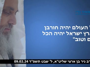 הרב ניר בן ארצי שליט”א: “כל העולם יהיה חורבן ובארץ ישראל יהיה הכל שלם וטוב” כל העולם יהיה חורבן ובארץ ישראל יהיה הכל שלם וטוב “צריכים להבין ולדעת שמדינת ישראל לא שייכת לאף אחד בעולם, רק לקדוש-ברוך-הוא בכבודו ובעצמו! זה הבית, זה הבית, זה המשכן, זה הבית של הקדוש-ברוך-הוא. שזה הבית של בורא עולם ושל ילדיו המאמינים בבורא עולם ולא שייך לאף עם בעולם. זה פיקדון שנתן לעם היהודי ואף אחד לא יכול לגעת בארץ הקודש. כל העולם יהיה חורבן, בארץ ישראל יהיה הכול שלם. כל המדינות בעולם יהיה...